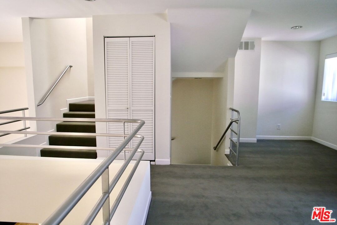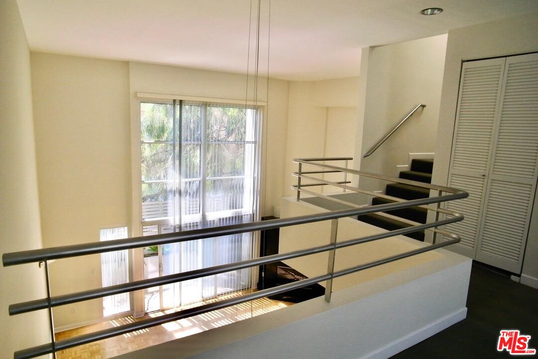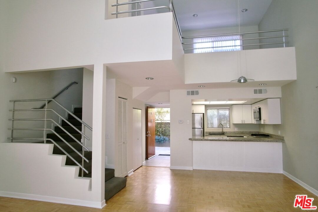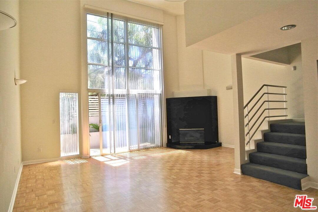 Architectural Townhome conveniently located between beach and UCLA w/ low $250 HOA. Situated in quiet rear location of building. Soaring ceilings with 2 story wall of glass that creates an airy, bright living space. Kitchen features Bosch appliances and granite counters. Living room features fireplace and glass doors to patio. Loft space offers office space or tv/playroom with balcony. Two bedrooms are en suite with balcony. Powder room. Laundry inside. Side by side parking garage with extra storage. Property walled and security gated.